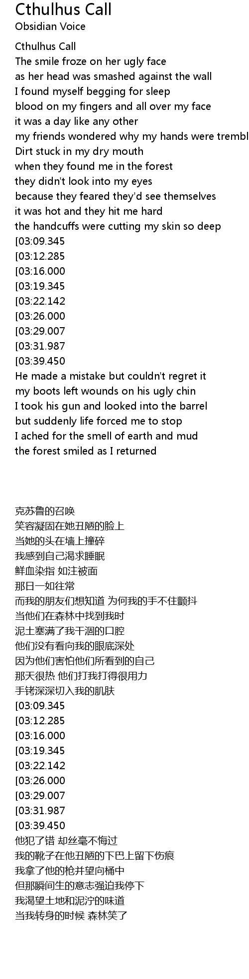 | [01:50.528][03:19.345] | Cthulhu' s calling |
