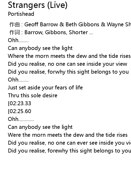 | [00:00.00] | 作曲 : Geoff Barrow & Beth Gibbons & Wayne Shorter & Adrian Utley |