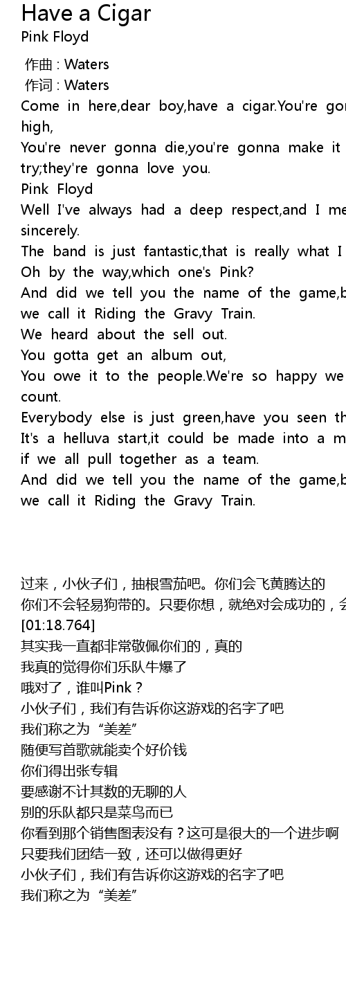 | [01:03.317] | Come in here, dear boy, have a cigar. You' re gonna go far, fly high, |