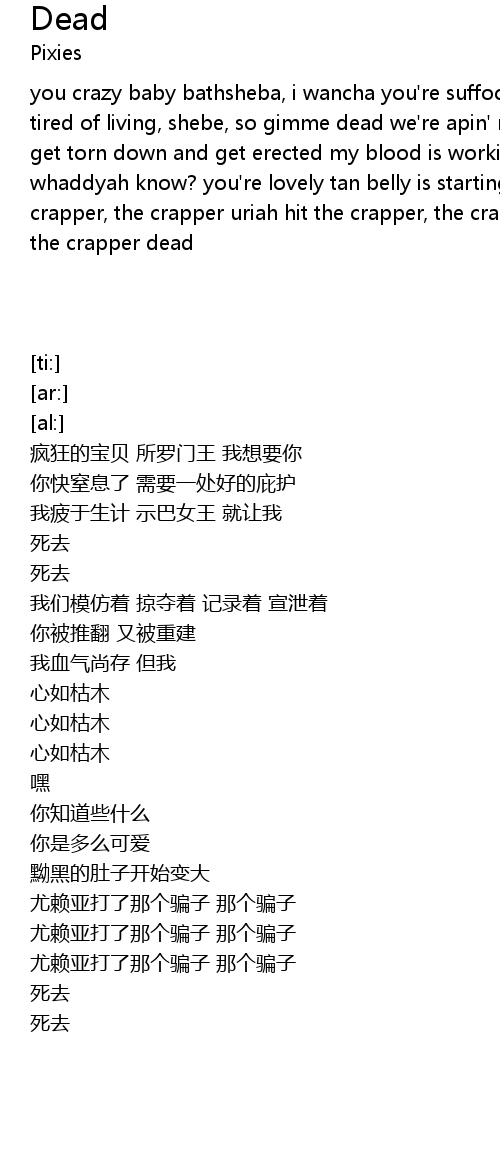 | you crazy baby bathsheba, i wancha you're suffocating you need a good shed i'm tired of living, shebe, so gimme dead we're apin' rapin' tapin' catharsis you get torn down and get erected my blood is working but my, my heart is dead hey whaddyah know? you're lovely tan belly is starting to grow uriah hit the crapper, the crapper uriah hit the crapper, the crapper uriah hit the crapper, the crapper dead |