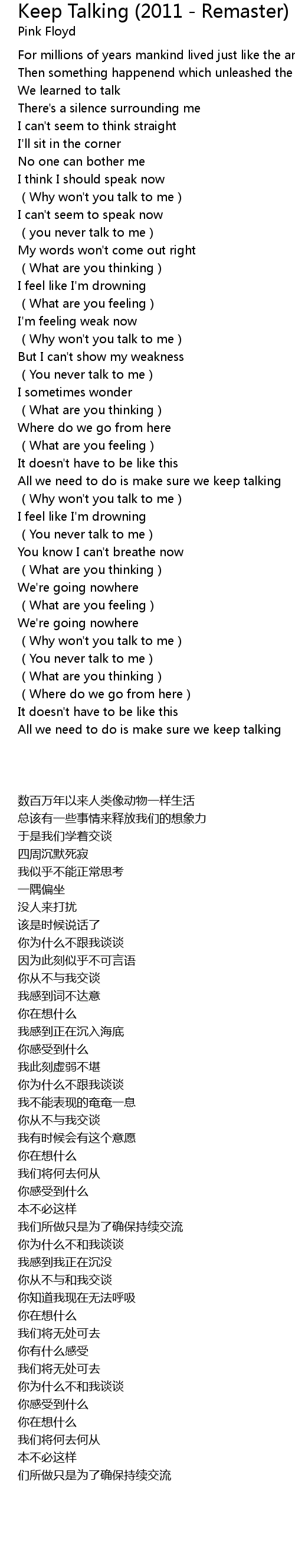| 歌曲 | Keep Talking (2011 - Remaster) |