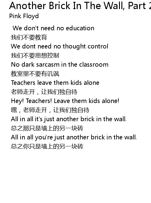 | 歌曲 | Another Brick In The Wall, Part 2 (2011 Remaster) |
