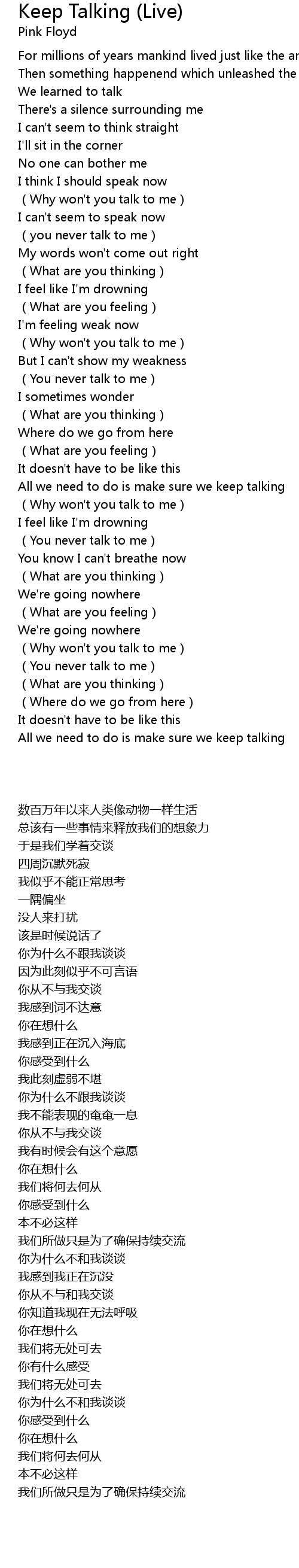 | 歌曲 | Keep Talking (Live) |