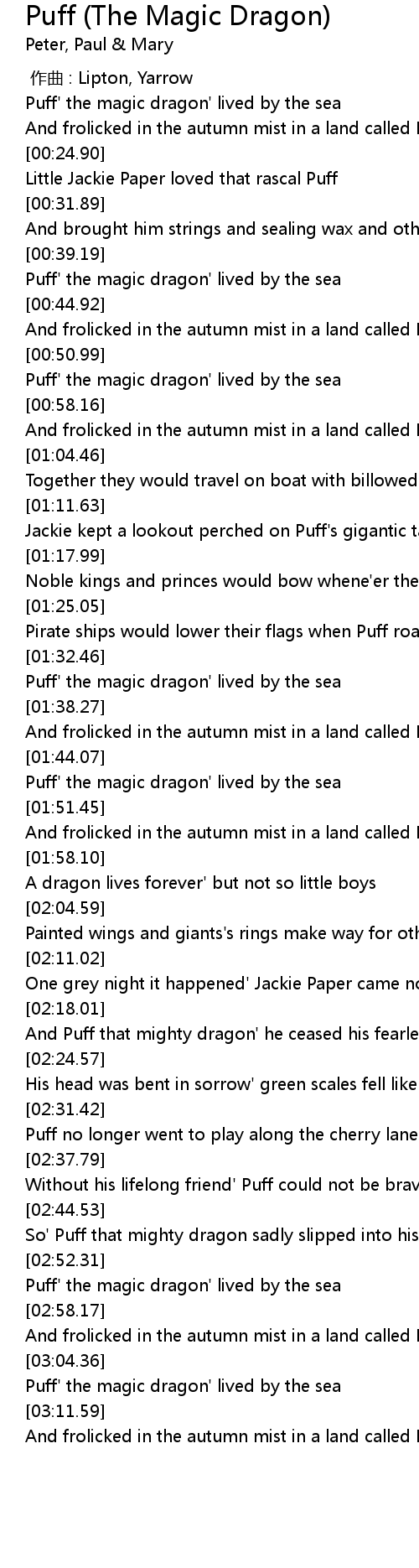| [00:39.93] | Puff' the magic dragon' lived by the sea |