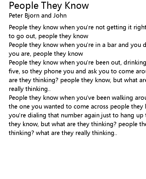 People they know when you're been out, drinking and you're not in bed until five, so they phone you and ask you to come around people they know, but what are they thinking? people they know, but what are they thinking? what are they really thinking.. |
