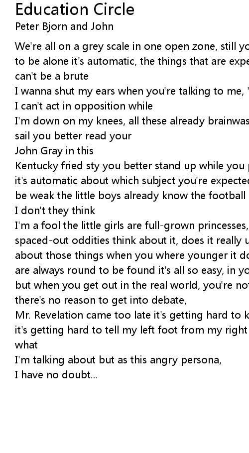 I'm a fool the little girls are full-grown princesses, and those who aren't are spaced-out oddities think about it, does it really upset you so did you think about those things when you where younger it doesn't matter, cause those things are always round to be found it's all so easy, in your academic little crowd, but when you get out in the real world, you're not so proud, of you're opinions there's no reason to get into debate, |