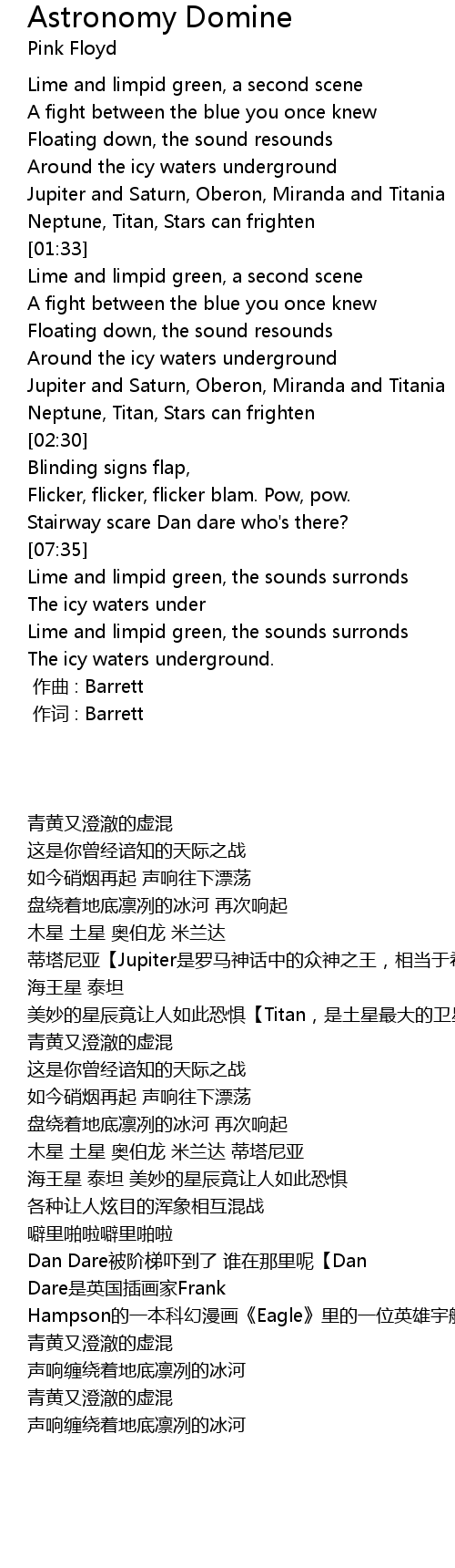 | [01:19] | 木星 土星 奥伯龙 米兰达 蒂塔尼亚【Jupiter是罗马神话中的众神之王,相当于希腊神话里的宙斯;Obero、Titania是《仲夏夜之梦》里的国王和王后;Miranda是《暴风雨》中的角色】 |