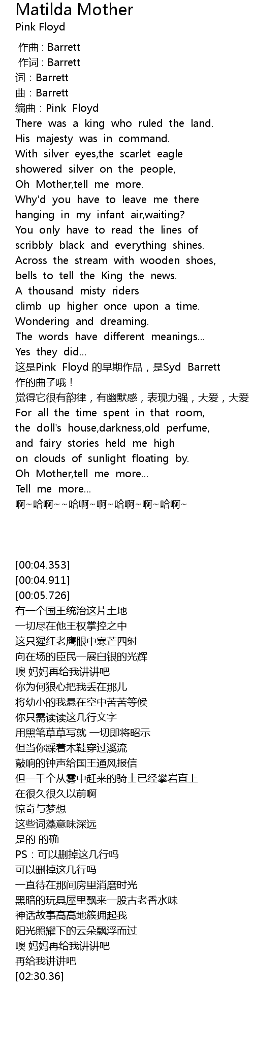 | [01:24.160] | 这是Pink Floyd 的早期作品,是Syd Barrett 作的曲子哦! |