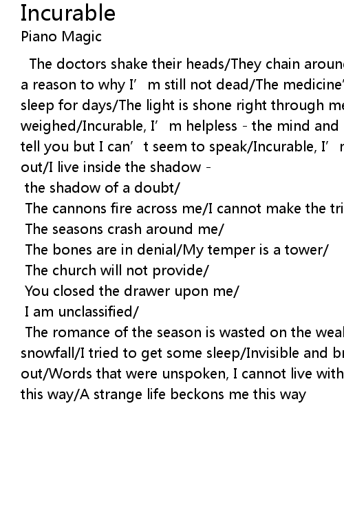 | The doctors shake their heads/They chain around the bed/They’re looking for a reason to why I’m still not dead/The medicine’s not working/I haven’t sleep for days/The light is shone right through me/The skeleton is weighed/Incurable, I’m helpless - the mind and body weak/I have so much to tell you but I can’t seem to speak/Incurable, I’m lonely/The city empties out/I live inside the shadow - | |