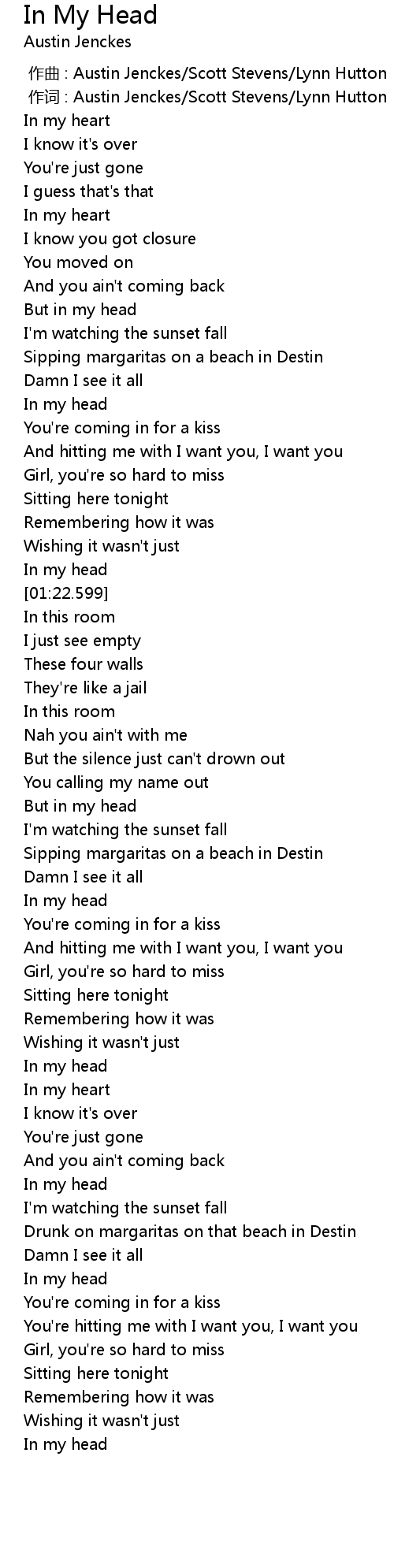 | [03:00.438] | Drunk on margaritas on that beach in Destin |