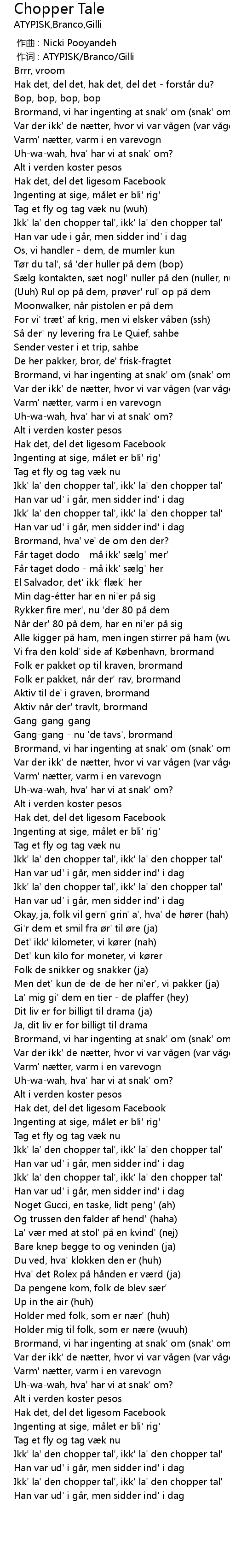 | [03:50.36] | Ikk' la' den chopper tal', ikk' la' den chopper tal' |