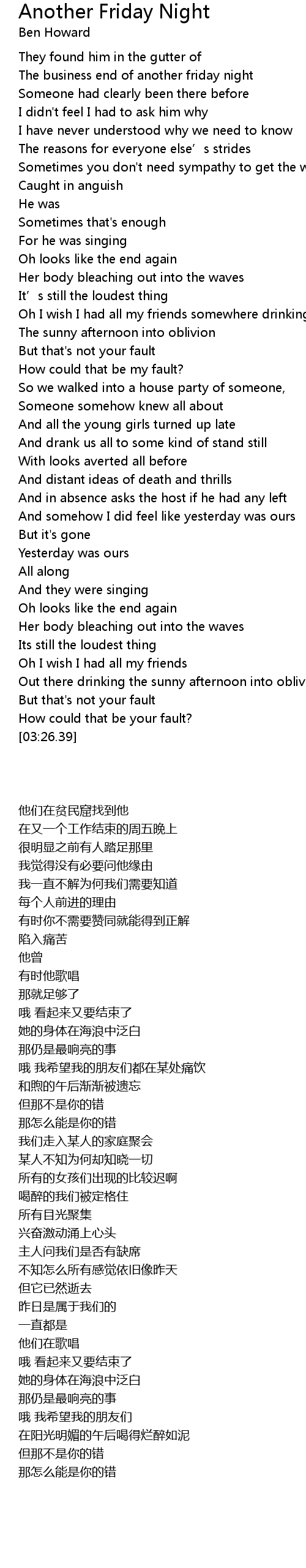 | [00:15.59] | 在又一个工作结束的周五晚上 |