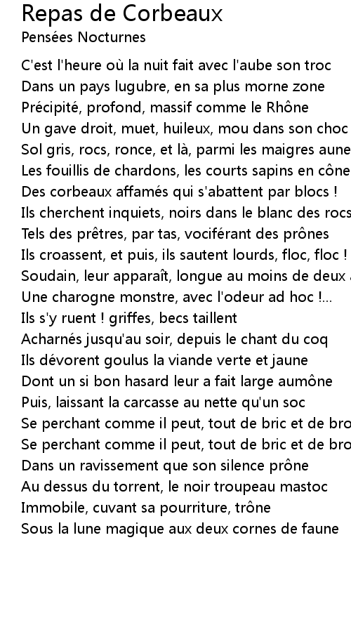 | [01:28.000] | Des corbeaux affame s qui s' abattent par blocs ! |