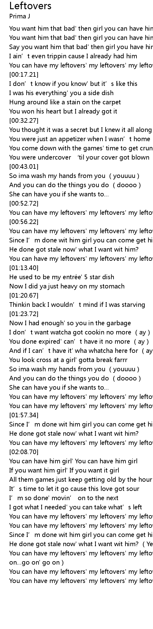 [02:47.21] You can have my leftovers' my leftovers' my leftovers (go on' go on…go on' go on)