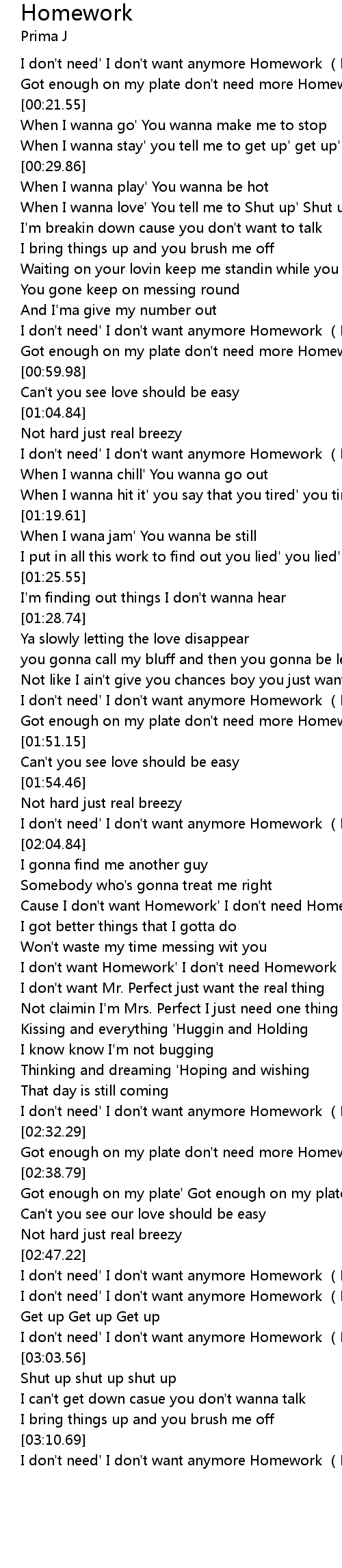 | [00:56.68] | Got enough on my plate don't need more Homework (Homework) |