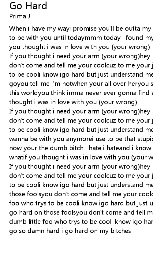 | If you thought i need your arm (your wrong)hey hey let go hard on those foolsyou don't come and tell me your coolcuz to me your just a dumb little foo who trys to be cooli know igo hard but just understand me me hahey hey let go hard on those foolsyou don't come and tell me your coolcuz to me your just a dumb little foo who trys to be cooli know igo hard but just understand me me hahey hey let go hard on those foolsyou don't come and tell me your coolcuz to me your just a dumb little foo who trys to be cooli know igo hard but just understand me me hai go so damn hard i go hard on my bitches |