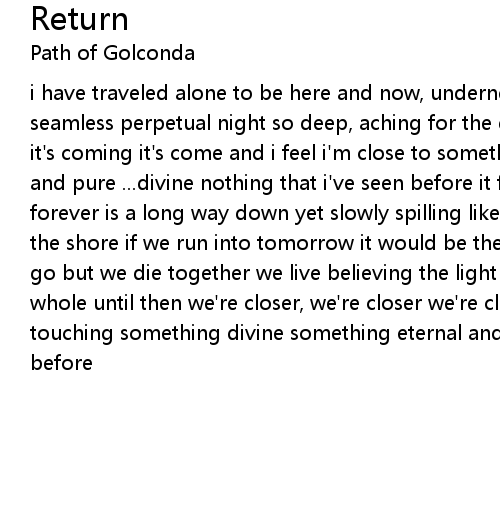 i have traveled alone to be here and now, underneath the faltering clear i dream seamless perpetual night so deep, aching for the dawn to arrive it's coming, it's coming it's come and i feel i'm close to something divine something eternal and pure ...divine nothing that i've seen before it feels like i'm falling and forever is a long way down yet slowly spilling like riverflow at the mouth of the shore if we run into tomorrow it would be the highest low it's as far as we go but we die together we live believing the light returns and we'll never be whole until then we're closer, we're closer we're close and i feel we're touching something divine something eternal and pure ...divine closer than ever before |