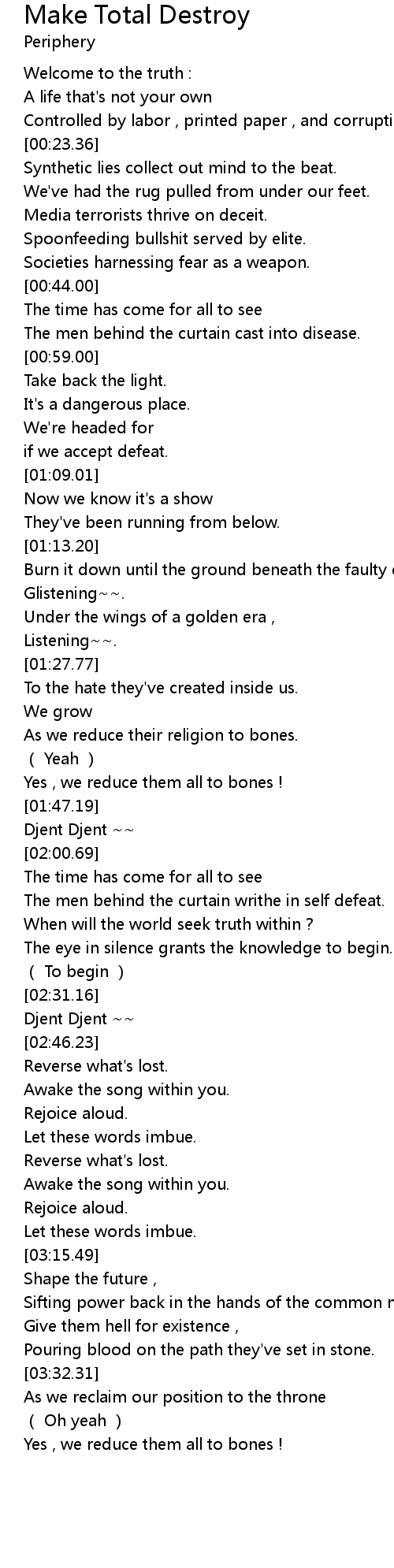 | [00:23.86] | Synthetic lies collect out mind to the beat. |