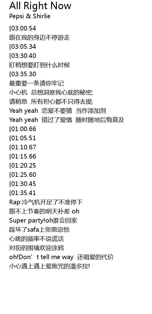 | [02:30.26][01:30.45] | all aright all right fán nǎo tōng tōng pāo dào hòu tái |