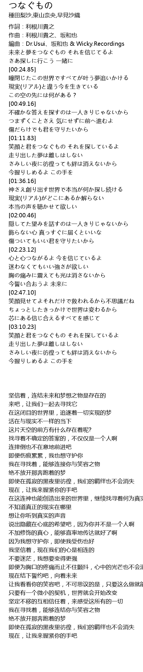 | [03:21.20] | 笑顔と君をつなぐもの それを探しているよ |