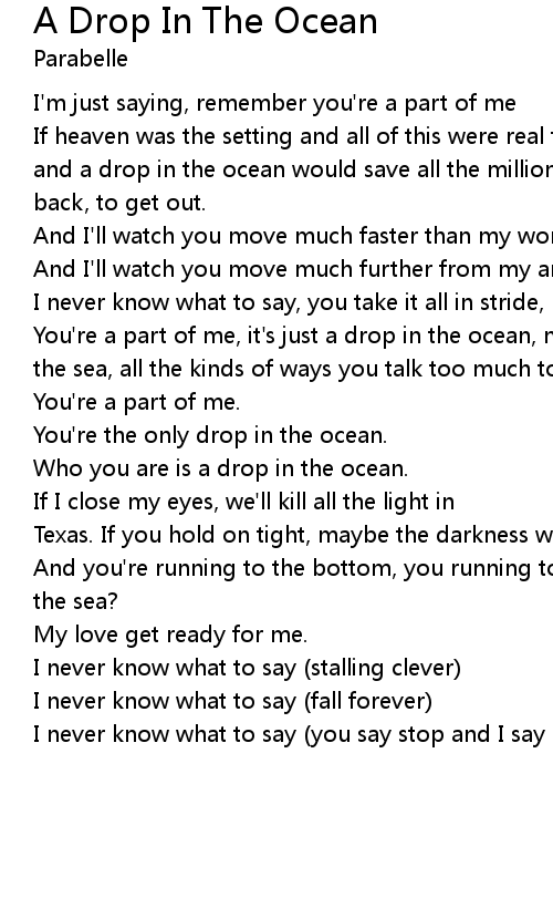You're a part of me, it's just a drop in the ocean, now find your way back to the sea, all the kinds of ways you talk too much to say what you think. |