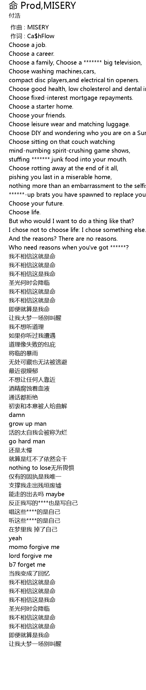 | [00:01.775] | Choose a family, Choose a ******* big television, |