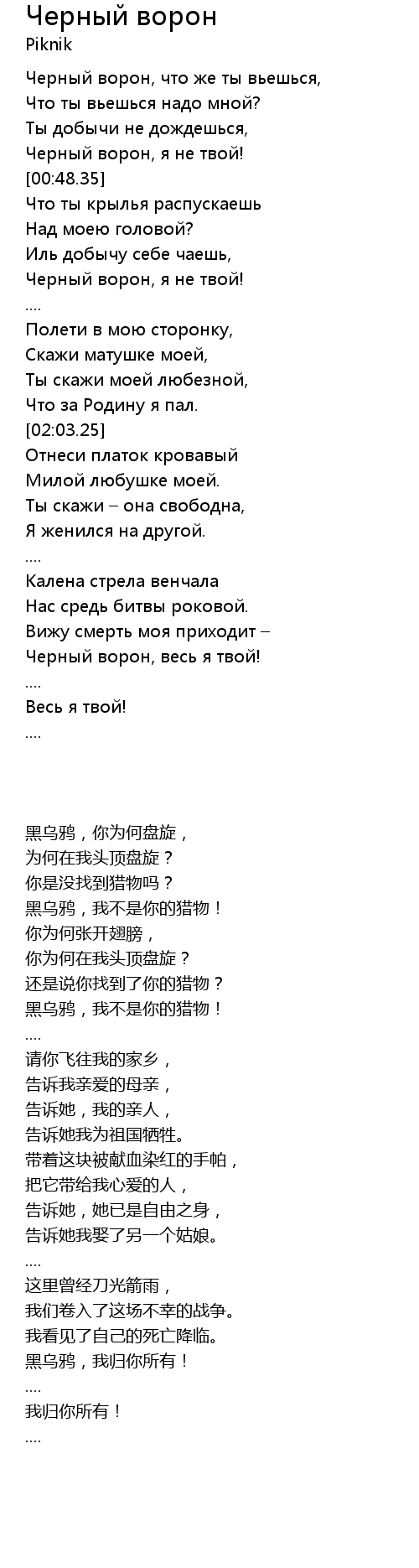 | [00:23.47] | Черный ворон, что же ты вьешься, |