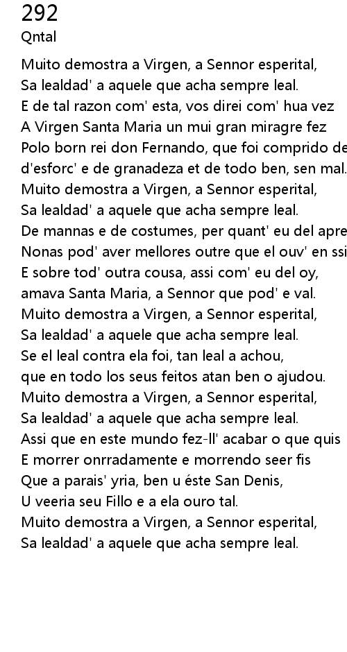 | Muito demostra a Virgen, a Sennor esperital, | |