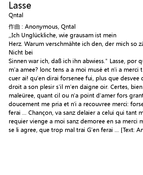 | Sinnen war ich, da ich ihn abwiess." Lasse, por quoi refusai celui qui tant m' a amee? lonc tens a a moi muse et n' i a merci trouvee. lasse, si tre s dur cuer ai! qu' en dirai forsenee fui, plus que desvee quant le refusai G' en ferai droit a son plesir s' il m' en daigne oir. Certes, bien me doi clamer et lasse et maleü ree, quant cil ou n' a point d' amer fors grant dou or et rosee tant doucement me pria et n' i a recouvree merci: forsenee fui quant ne I' amai G' en ferai ... Chan on, va sanz delaier a celui qui tant m' agree por Deu li pri et requier vienge a moi sanz demoree en sa merci me metrai, tost avrai pe s trovee se li agree, que trop mal trai G' en ferai ... Text: Anonym, Frankreich |