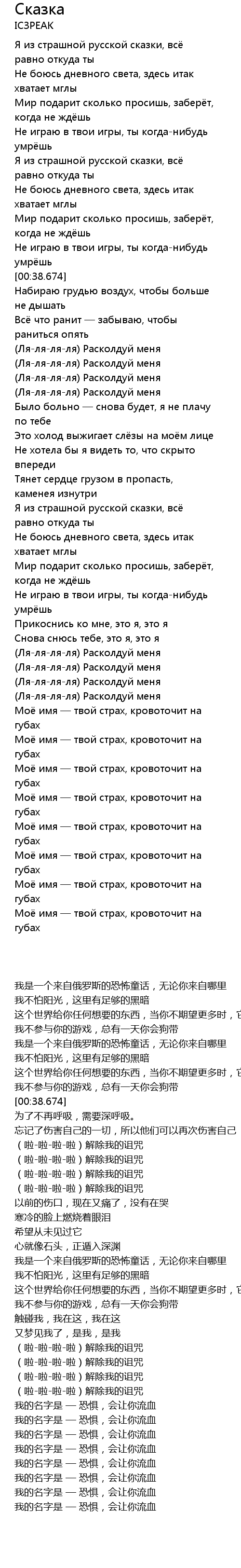 | [00:21.407] | Я из страшной русской сказки, всё равно откуда ты |