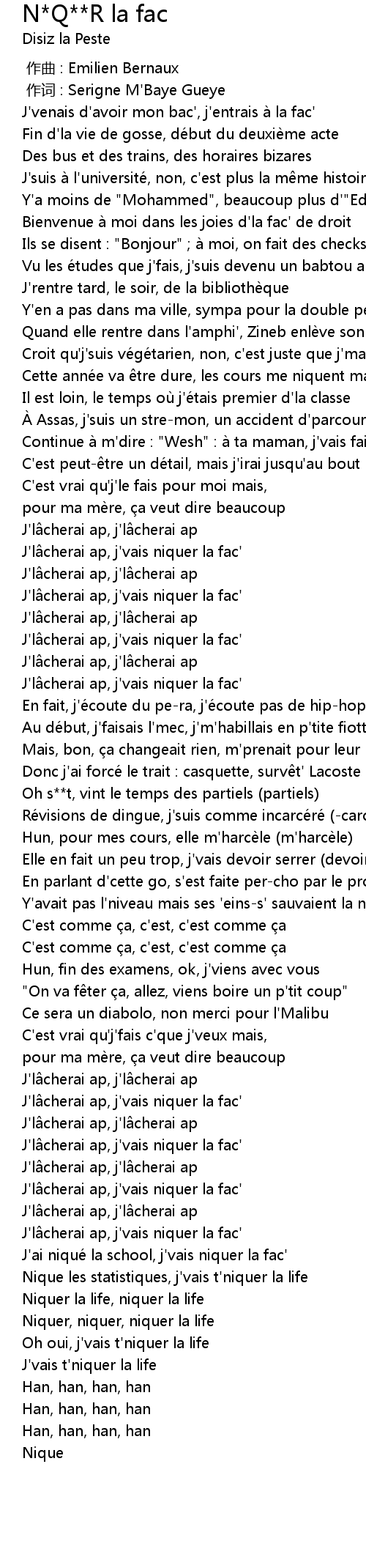 | [02:16.49] | J' ai nique la school, j' vais niquer la fac' |