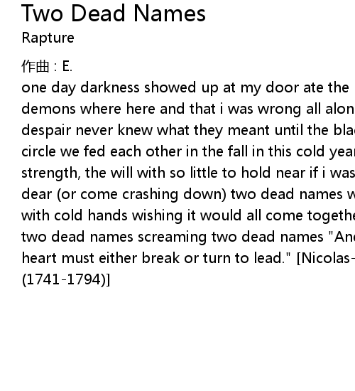 | one day darkness showed up at my door ate the light, closed my world told me the demons where here and that i was wrong all along everything washes away fear and despair never knew what they meant until the black came my way in our full circle we fed each other in the fall in this cold year that consumed the strength, the will with so little to hold near if i was the sky would i hold you dear or come crashing down two dead names waiting two dead names reaching out with cold hands wishing it would all come together in a final infinite white two dead names screaming two dead names " And so I leave this world, where the heart must either break or turn to lead." NicolasSebastien Chamfort 17411794 |