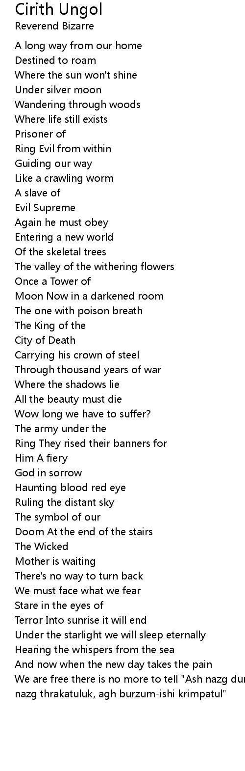 We are free there is no more to tell "Ash nazg durbatuluk, ash nazg gimbatul ash nazg thrakatuluk, agh burzum-ishi krimpatul" |