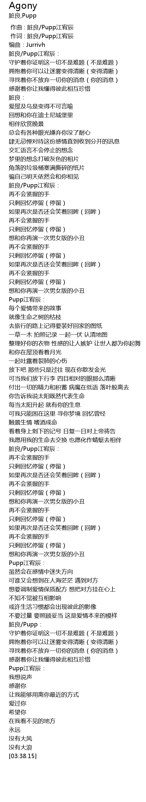 | [00:01.000] | 作词 : 脏良/Pupp江宥辰 |