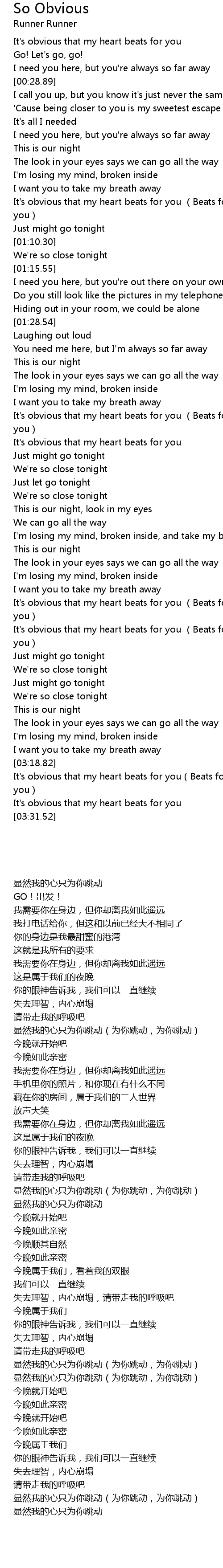 | [01:50.67] | It's obvious that my heart beats for you (Beats for you, beats for you) |