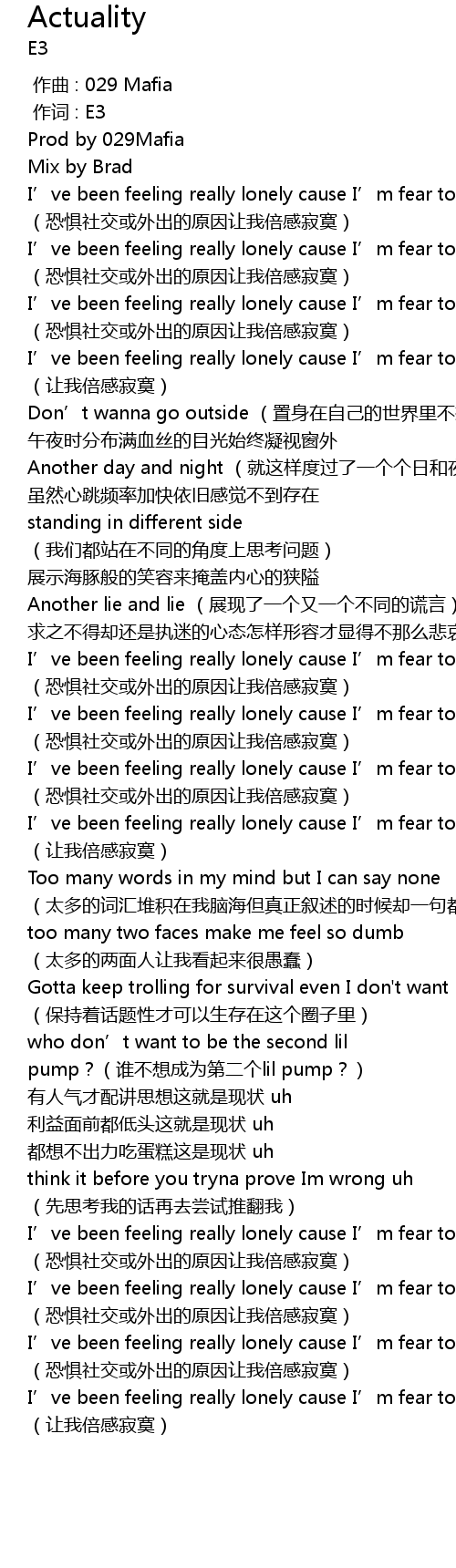 | [00:20.56] | I’ve been feeling really lonely cause I’m fear to go outside (恐惧社交或外出的原因让我倍感寂寞) |