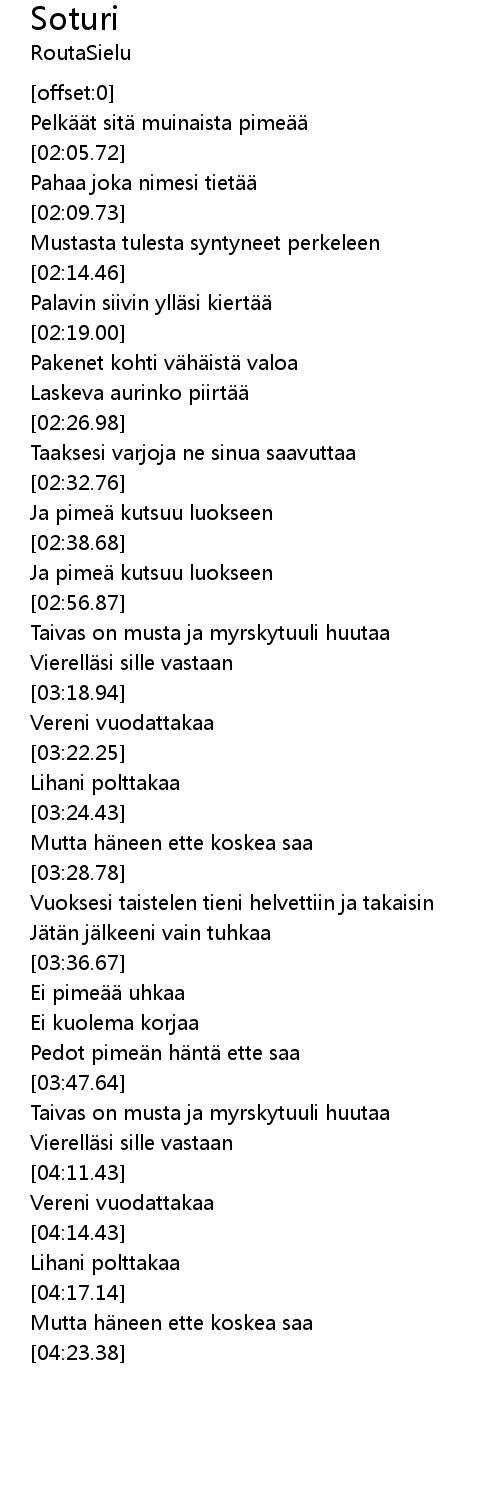 | [03:12.01] | Taivas on musta ja myrskytuuli huutaa |