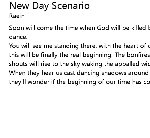 | You will see me standing there, with the heart of our fate in my hands, praying this will be finally the real beginning. The bonfires will be burning, our shouts will rise to the sky waking the appalled widowers. | |