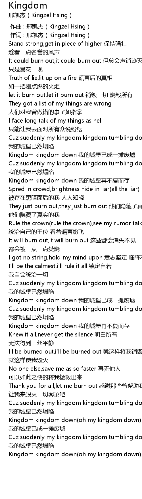 | [03:42.76] | Kingdom kingdom down oh my kingdom down wǒ de chéng bǎo zài bù fù ér cún |