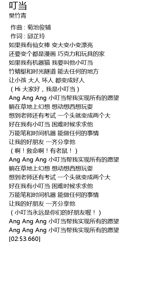 | [01:37.780] | Ang Ang Ang 小叮当帮我实现所有的愿望 |