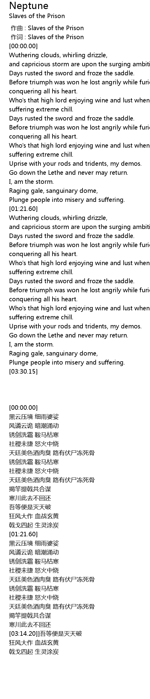 | [00:00.000] | 作词 : Slaves of the Prison |