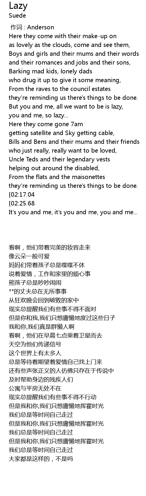 | [02:34.35][02:17.04][01:39.91] | But you and me, all we want to be is lazy, |