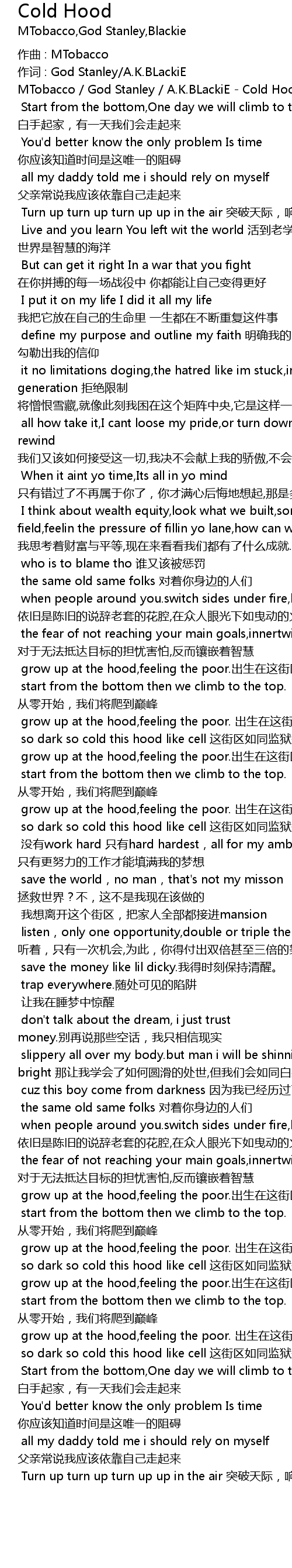 | [01:33] | grow up at the hood,feeling the poor.出生在这街区,白手起家 |