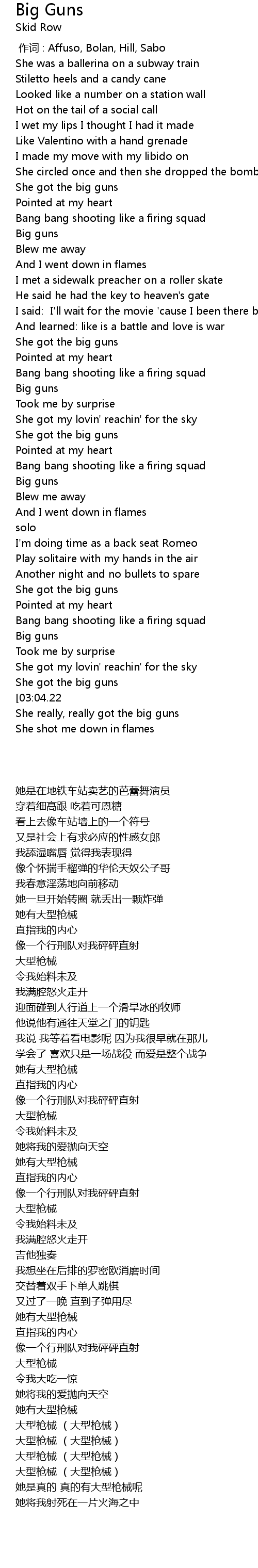 | [03:06.39][03:04.22][03:03.76][02:55.52] | Big guns (Big guns) |