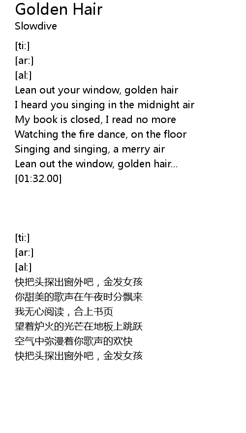 | [00:10.00] | Lean out your window, golden hair |