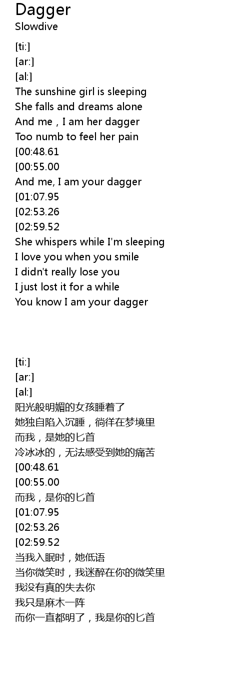 | [02:39.57] | 而你一直都明了,我是你的匕首 |