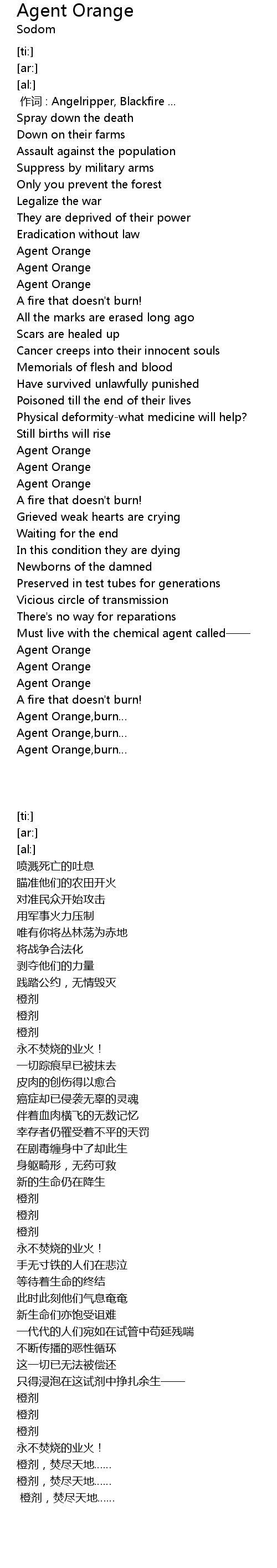 | [06:00.65] | Agent Orange, burn |