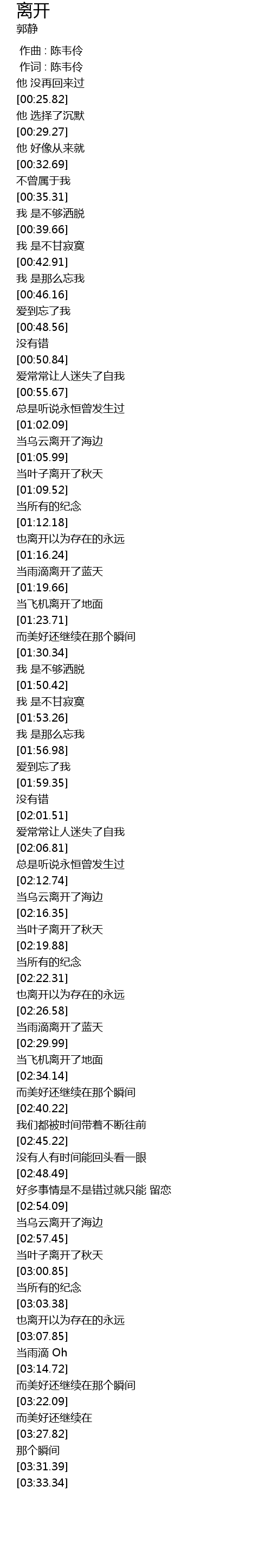 | [03:04.14] | yě lí kāi yǐ wéi cún zài de yǒng yuǎn |