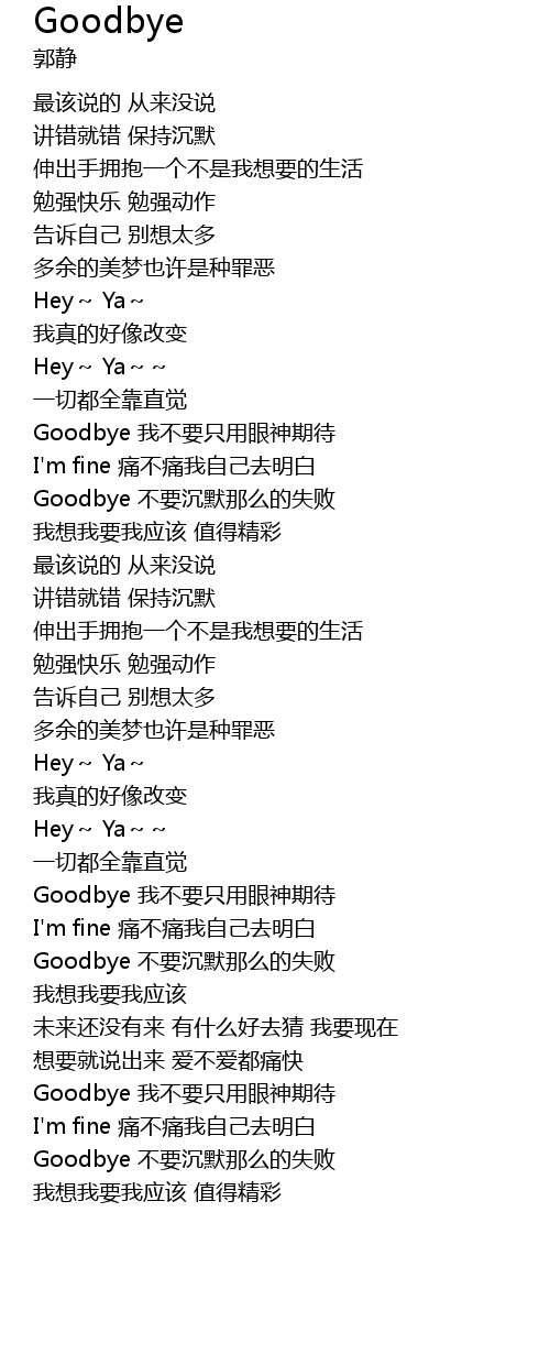 | [02:46.80] | Goodbye wǒ bú yào zhǐ yòng yǎn shén qī dài |