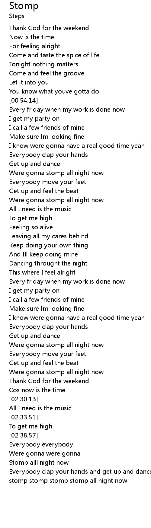 | [02:56.60] | Everybody clap your hands and get up and dance were gonna stomp stomp stomp stomp stomp stomp all night now |